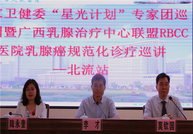 为了进一步提高本地区乳腺癌的规范化治疗水平,提高本地区医务人员乳腺癌的诊治水平,提高乳腺癌患者的生存质量,我院于5月25日在内科楼13楼会议室举办了自治区级继续医学教育项目《乳腺癌的全程管理及精准治疗学习班》、国家卫健委“星光计划”专家团巡讲暨广西乳腺治疗中心联盟RBCC医院乳腺癌规范化诊疗巡讲(北流站)》学习班,我们邀请到了广西医科大学附属肿瘤医院莫钦国、陆永奎、陈龙3位教授为本次学习班授课,并邀请广西医科大学附属肿瘤医院赖少侣主任医师、钟武宁博士作为乳腺癌MDT病例讨论嘉宾,院内、外近300多名学员参加了此次学习。
