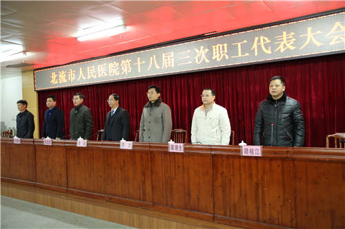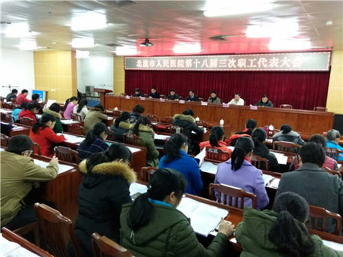 1月12日下午,北流市人民医院第十八届三次职工代表大会在内科楼十三楼会议室隆重召开。凌政、李才、吴显儒、蒋靖生、苏福锦、胡桂江、陈雁等医院领导悉数出席大会,145名正式代表和11名列席代表参会,会议由工会主席胡桂江主持。
