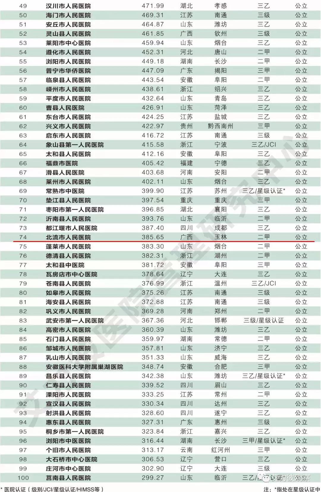 北流市人民医院双榜齐名,连续4年挺进中国县级医院百强榜单;在中国省域医院30强排行榜中,北流市人民医院也挺进广西省域30强,是上榜医院中唯一的一家二级医院。