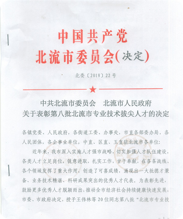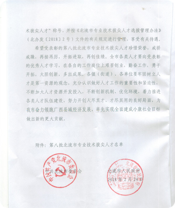 3月20日,我院人事科收到《中共北流市委员会 北流市人民政府关于表彰第八批北流市专业技术拔尖人才的决定》(北委〔2018〕22号),共授予王伟林等20位同志第八批“北流市专业技术拔尖人才”称号。其中我院凌政、吴显儒、植华德、肖淑宁、陈斌、罗坚共6位同志获此殊荣。