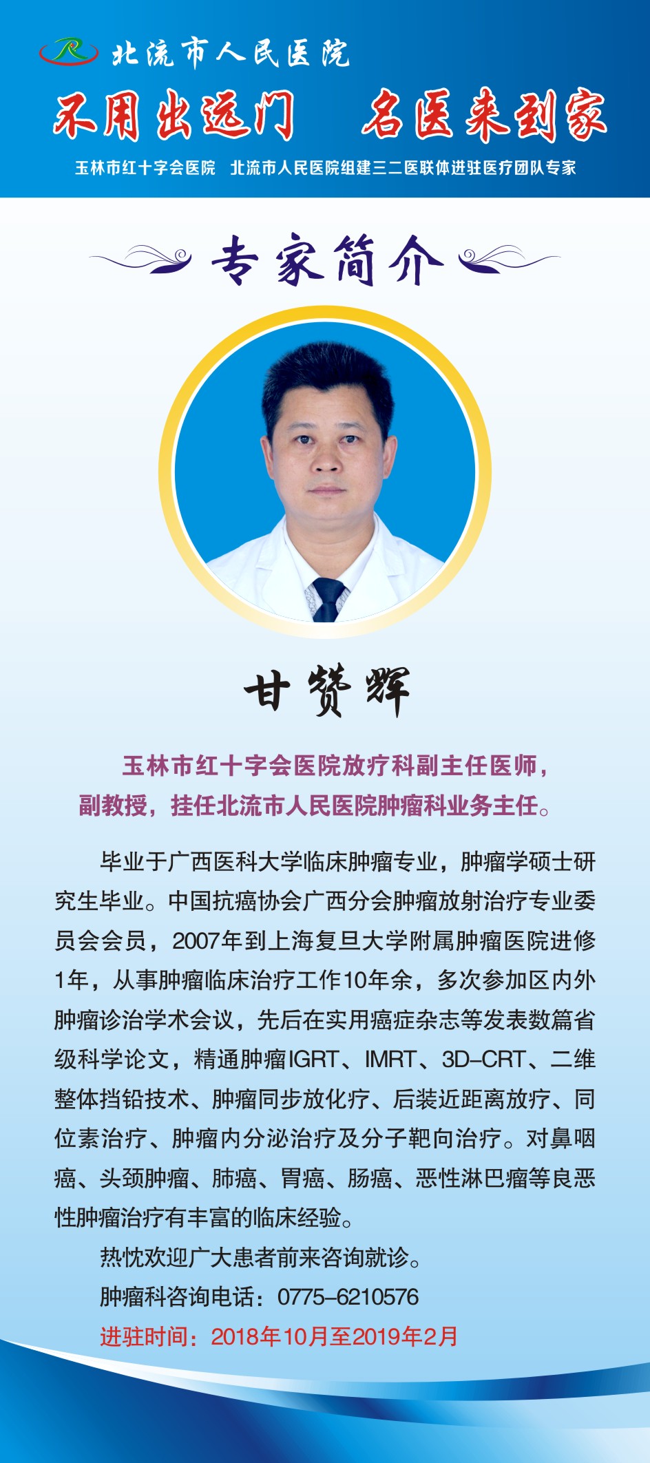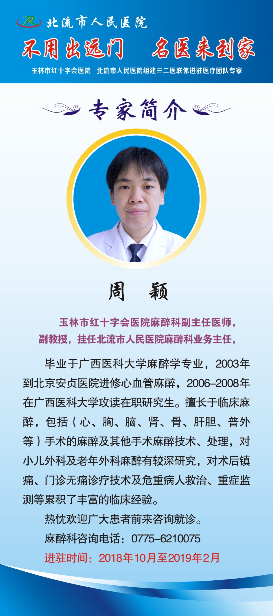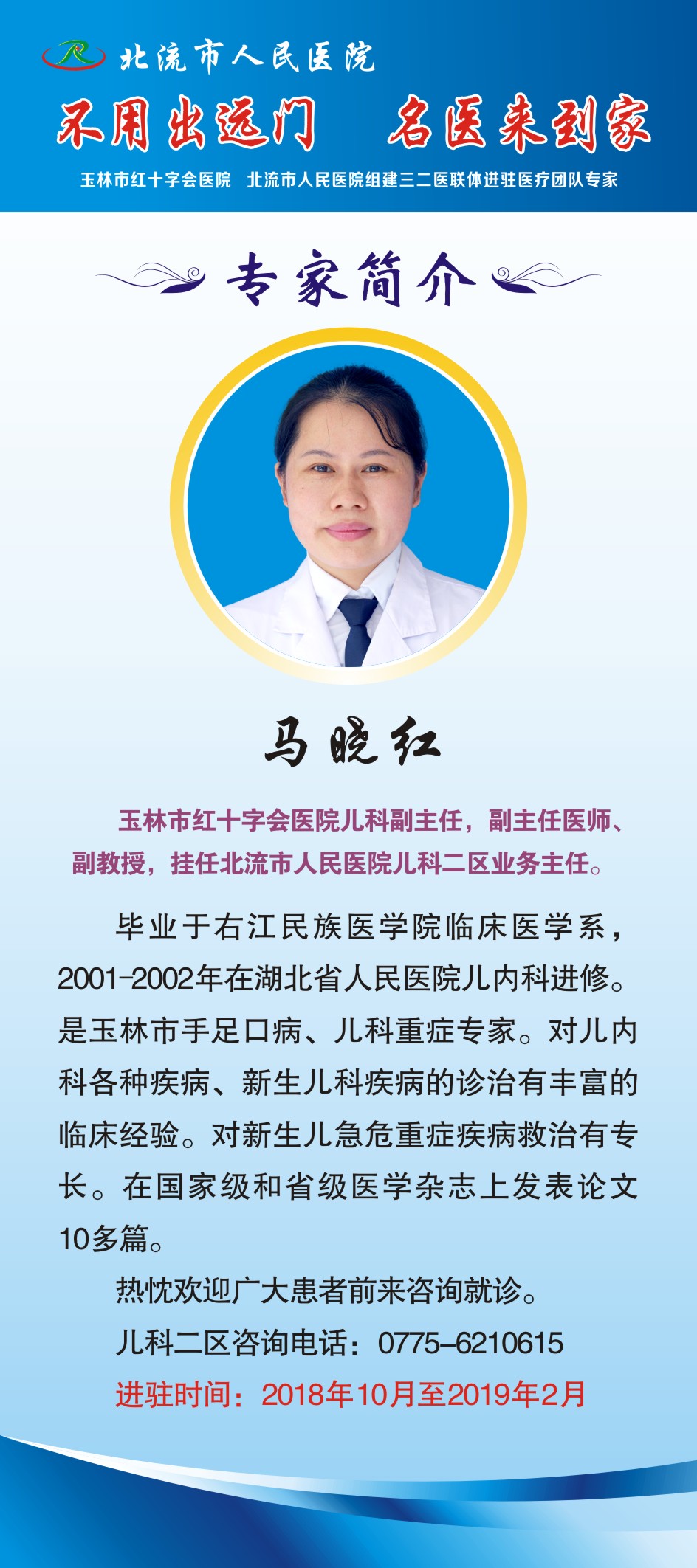 为让北流百姓不用出远门,就能享受到三级医院优质的医疗服务,10月8日,北流市人民医院迎来玉林市红十字会医院首批三二医联体进驻专家,专家团队由妇科吴雪峰主任医师、儿科马晓红副主任医师、消化内科余绪锋副主任医师、放疗科甘赞辉副主任医师、麻醉科周颖副主任医师五位成员组成。驻院时间:2018年10月8日——2019年2月。