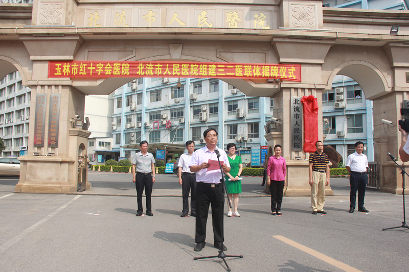 医联体建设是深化医改的重点工作,是推进分级诊疗的抓手,根据自治区人民政府《关于印发广西加快推进医疗联合体建设和发展实施方案的通知》的精神要求,9月7日上午,玉林市红十字会医院和北流市人民医院在北流市举行组建三二紧密型医疗联合体揭牌仪式。玉林市卫计委副主任刘丽珍,北流市常委、宣传部部长、副市长陈素贞,玉林市红十字会医院院长杨昭坚,北流市人民医院院长凌政及两院中层以上领导代表100多人参与了揭牌仪式。仪式由北流市卫计局党组副书记、副局长、党工委书记覃德军主持。