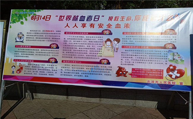 为弘扬无偿献血者乐于奉献的精神,做好无偿献血工作的宣传,促进无偿献血事业健康可持续发展,推动我市争创全国文明城市。14日上午,北流市人民医院组织输血科、预防保健科、外联部等医务人员到南园公园参加了由北流市卫健局开展的“世界献血者日”大型宣传活动。
