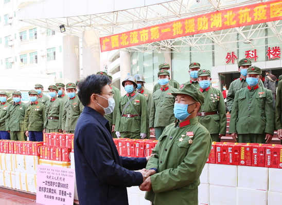 2月23日,北流市“两参”协会、桂平市“两参”协会的退伍老兵向我院捐赠一次性防护口罩5000只和饮料、百香果一批,总价值30000多元,鼓励我院广大党员干部职工团结一致,打赢这场没有硝烟的疫情阻击战!