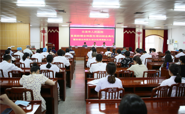 8月18日上午,北流市人民医院首届助理全科医生培训结业典礼暨助理全科医生培训优秀个人表彰大会在内科楼13楼会议室举行,结业典礼由吴显儒常务副院长主持。北流市卫生健康局副局长梁高、医院党委书记李才及医院党政领导班子成员、相关职能部门负责人、基层实践基地负责人、带教老师、教学秘书以及全体助理全科医生学员共120多人参加了结业典礼。