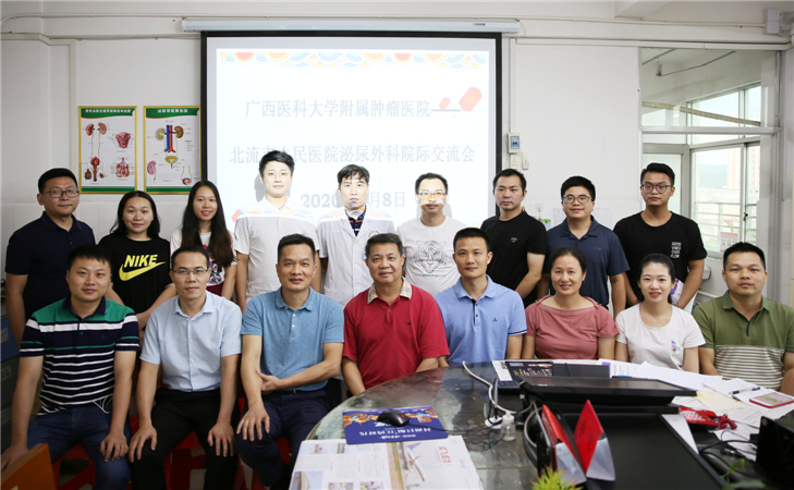 8月8日下午,我院与广西医科大学附属肿瘤医院在泌尿外科举办了院际交流会,有幸邀请到广西医科大学附属肿瘤医院蒙清贵、邓程恩、张庆云三位教授与我院泌尿外科的医护人员一起,共同探讨泌尿系统重大疾病转移治疗的现状和研究热点。交流会由泌尿外科李晖主任主持。
