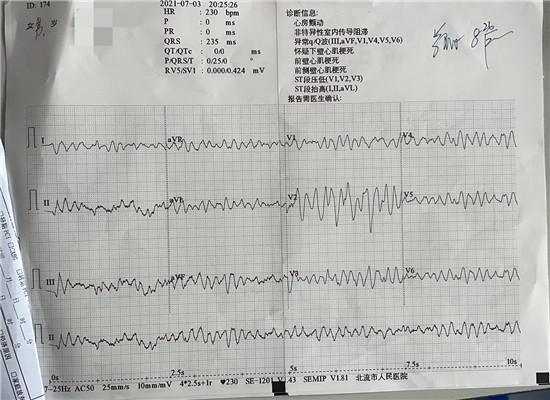 20时25分急诊科接诊后,对患者快速开展了除颤,心肺复苏术,检验床边心肌等三项急救措施。心血管内科医生进行紧急会诊后,确认患者为急性ST抬高型前壁心肌梗死并为患者注射了那曲肝素钙抗凝。随后电话请示心血管内科赵子粼博士、张轩副主任,二人立即赶赴医院,经全面评估后决定对患者行急诊PCI手术。卫科保安见状,立即联系急诊科。