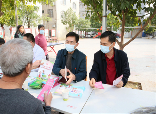 北流市人民医院党委书记李才(右二)、富林塘社区党支部书记梁国柱(右一)向群众宣教
