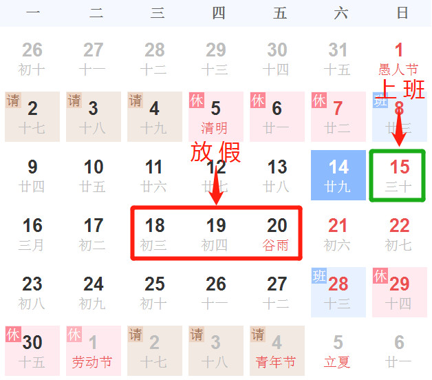 二、4月20日(周五)与4月15日(星期日)调休,4月15日(星期日)正常上班。