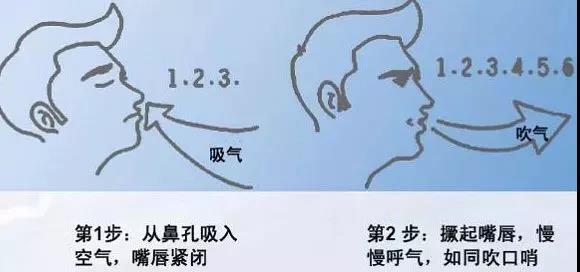 缩唇呼吸法:用鼻吸气,缩唇做吹口哨样缓慢呼气,以能使距离口唇30厘米处与唇等高点水平的蜡烛火焰随气流倾斜又不致熄灭为宜。每天3次,每次30分钟。